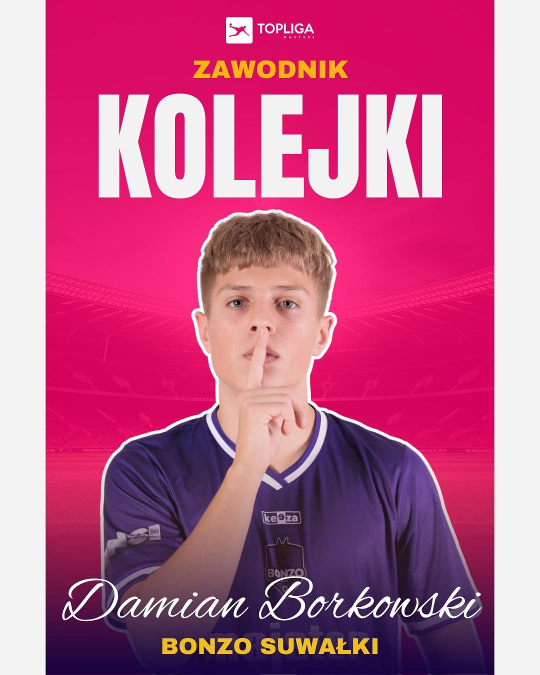 🎉 #KibiceNaMedal zadecydowali, że to Damian Borkowski broniący barw Bonzo Suwałki zostanie zawodnikiem IX kolejki piłkarskiej Top Ligi Masters 👑✨ Pamiątkowa nagroda trafi w jego ręce tuż przed rozpoczęciem spotkania przeciwko PORTA Active Team ⚽💥